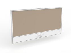 Studio screen to fit Agile shared desk. White powdercoated 50mm frame and lightweight, pinnable core with Breathe fabric. Includes desk hung screen brackets. Optional in-screen ducting.